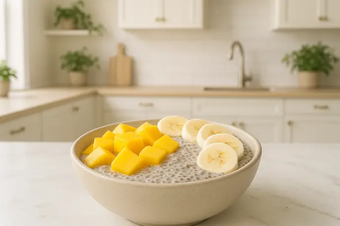 Pudding cremoso de chía y avena con mango y plátano.